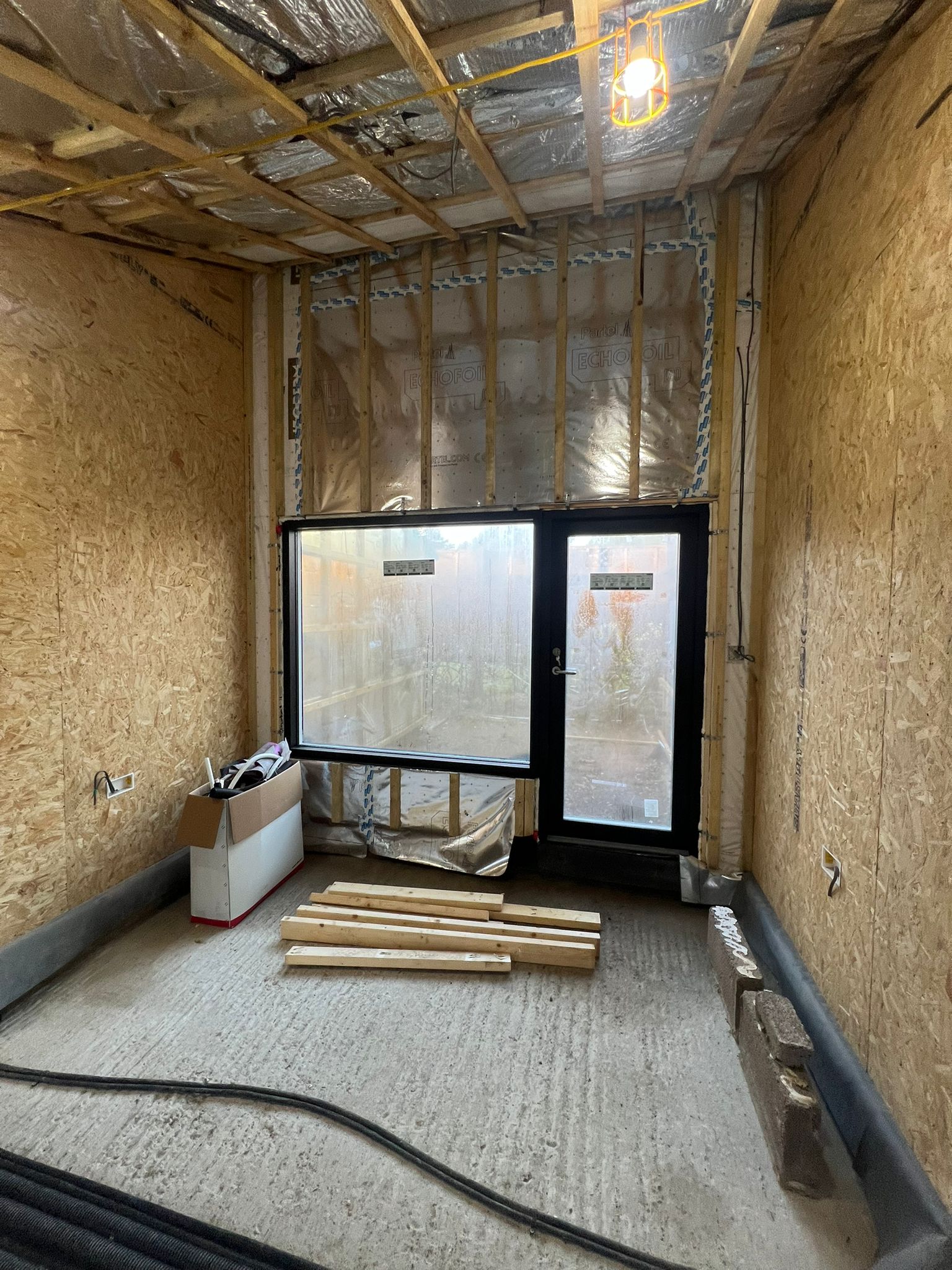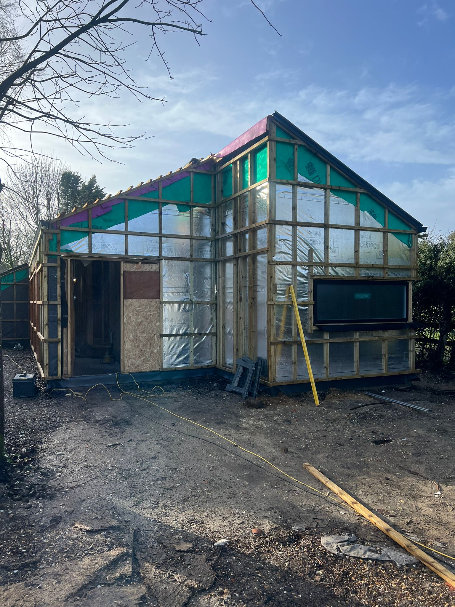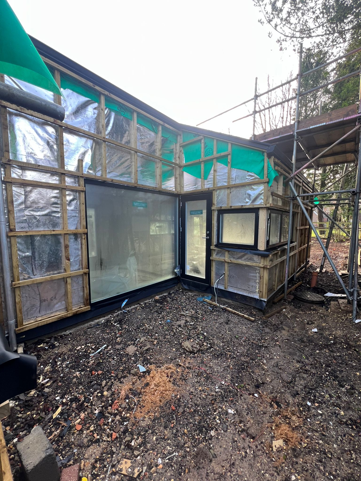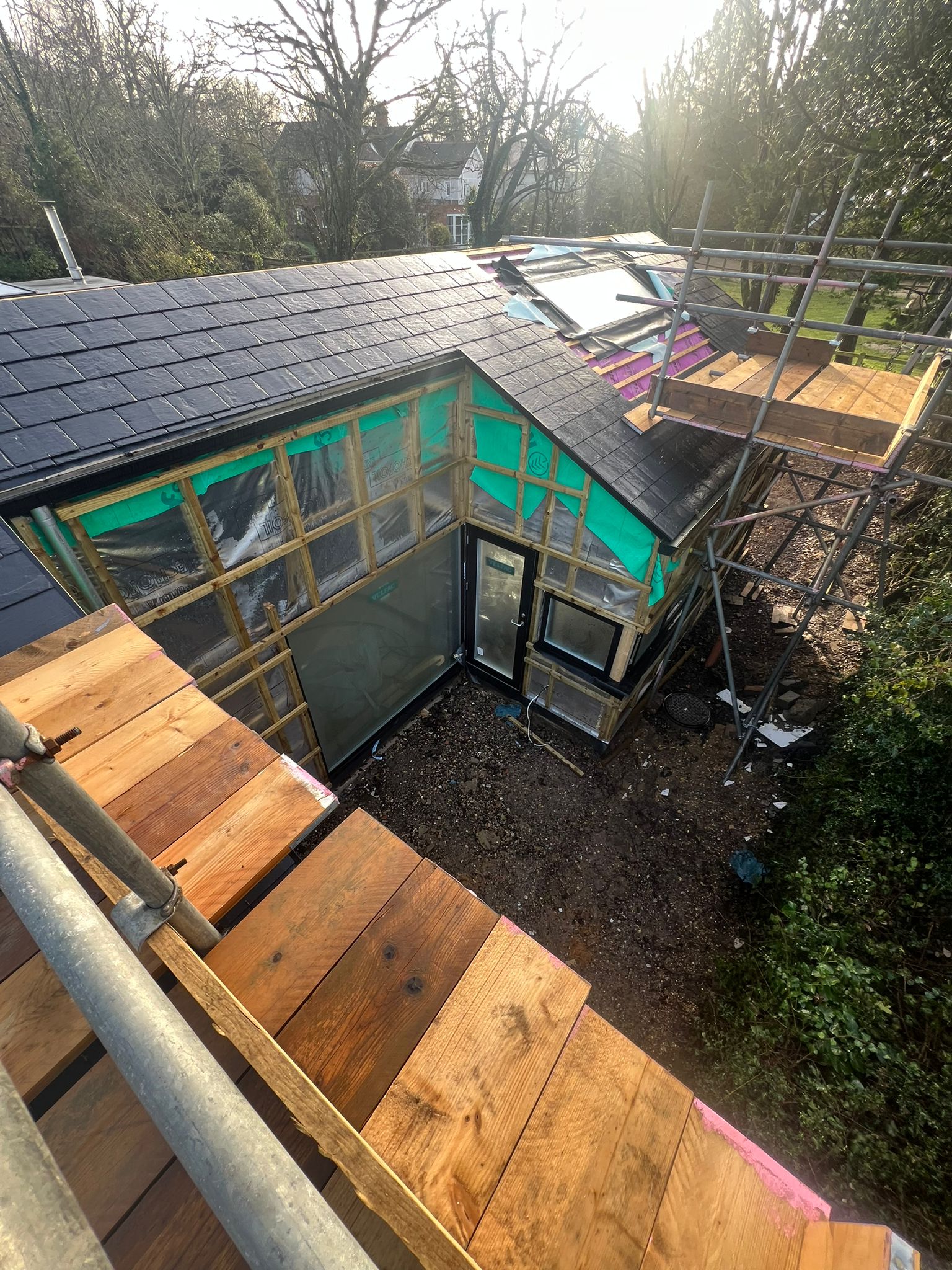 With the glazing fully installed and the roof now tiled, the project is now completely enclosed and protected from the elements. This marks a key transition on site, allowing the construction team to move their focus to the internal works, including plumbing, electrics, and finishes. From this stage on, the scheme will begins to feel more like a home and less like a building site.