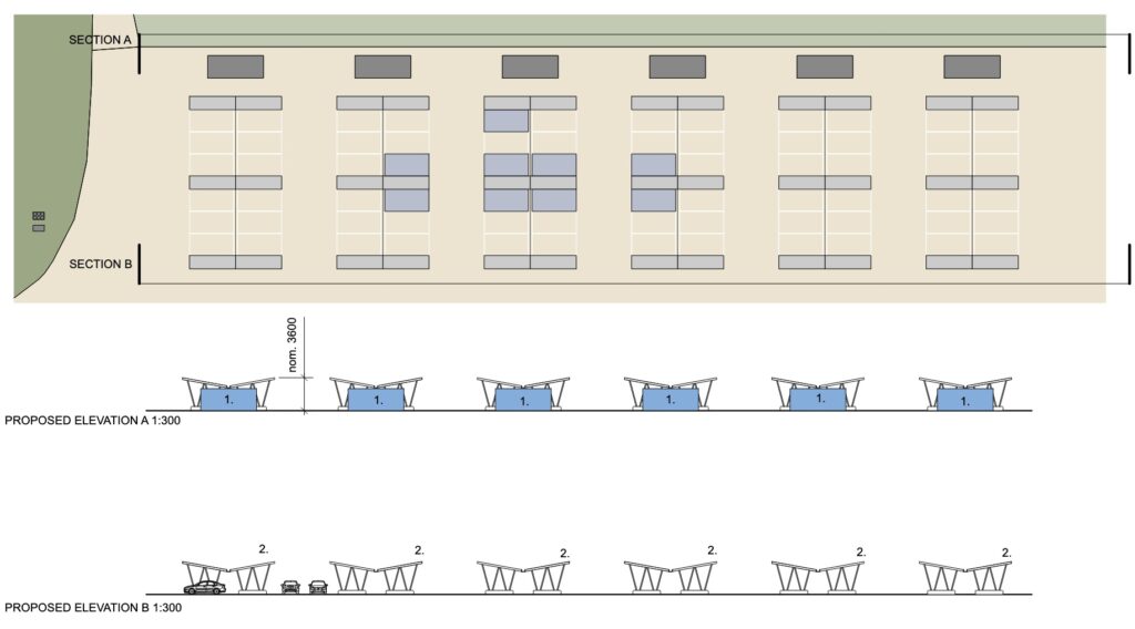The project delivers over 20 EV charging spaces, designed with solar panels installed on butterfly roofs, which are linked to battery storage and a back up generator.